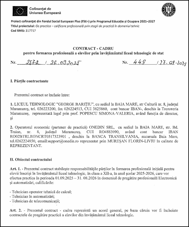 În data de 26 septembrie 2025, Liceul Tehnologic „George Barițiu” Baia Mare a semnat contractul-cadru de parteneriat pentru practică cu ONEDIN SRL, în cadrul proiectului GO PRACTICA – calificare profesională pentru viitor.